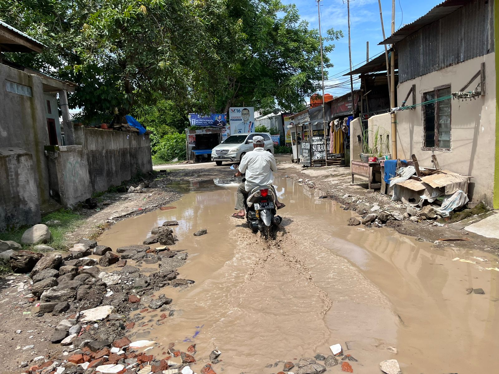 Daeng Rongrong juga keluhkan air yang tergenang, setiap kendaraan roda empat yang berlalu lalang di jalan genangan air yang berlumpur tersebut masuk ke dalam rumahnya.