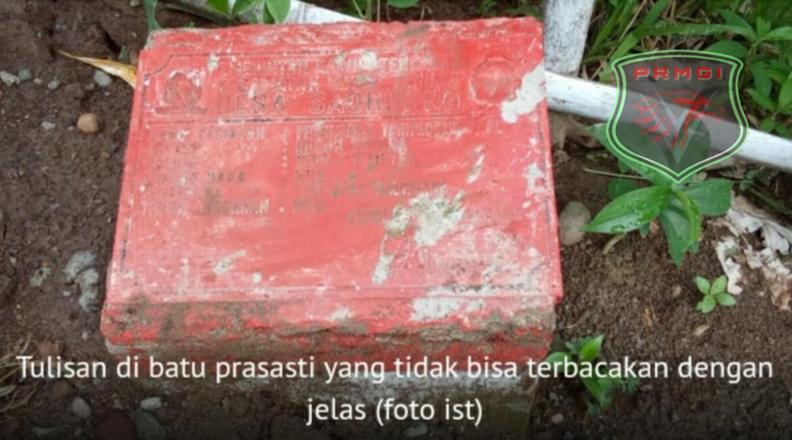 Begitu pula pada batu prasasti pekerjaan rabat beton itu, tampaknya terkesan ada upaya mengaburkan tulisannya yang sulit terbacakan, lantaran dasar batu prasastinya di cat merah dengan tulisan tipis warna kecoklat-coklatan.
