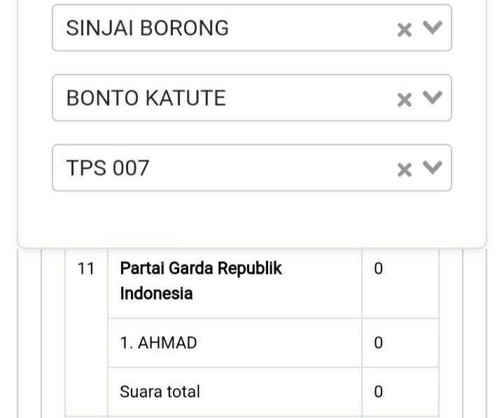 Sementara salah satu caleg DPRD Kabupaten Sinjai Partai Garda Republik Indonesia (GARUDA) dari Dapil 3 Selatan-Borong (AHMAD) menambahkan komentarnya bahwa “Kok bisa suara saya di TPS 007 di Desa Bontokatute Sinjai Borong tidak ada, alias kosong. Pada hal suara saya di TPS 007 ada sekitar 47 suara kalau tidak salah ingat, apa lagi di TPS tersebut tempat saya mencoblos bersama keluarga saya, dan masa tidak ada suara saya sama sekali. Itu tidak masuk akal.” Tuturnya.
