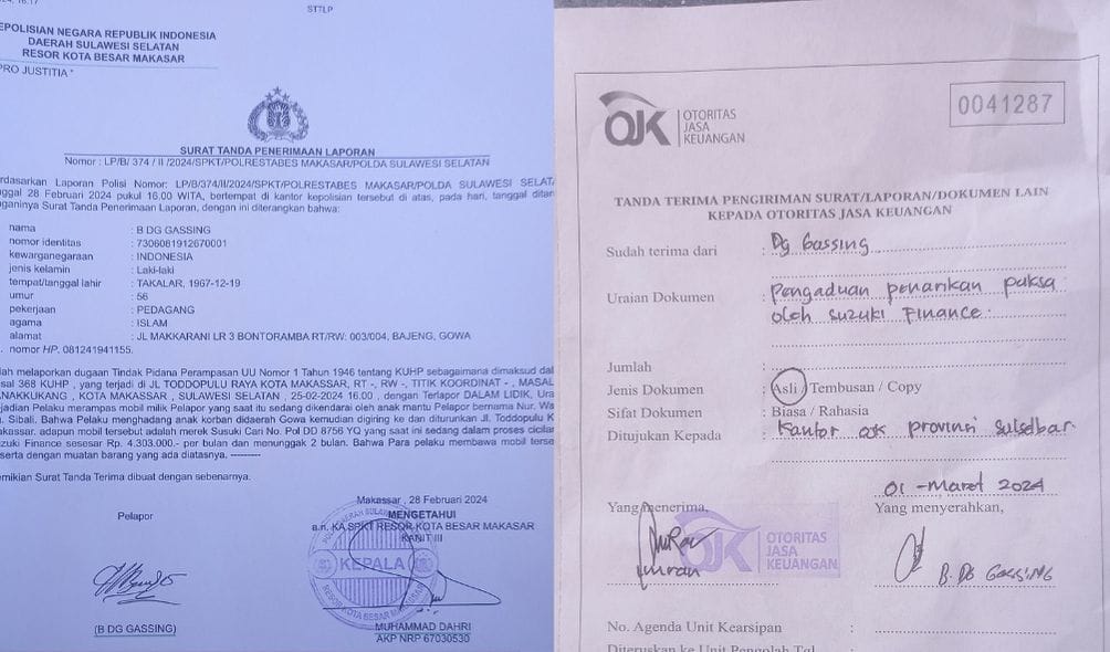 Foto dok. Surat laporan di Mapolrestabes Makassar dan OJK