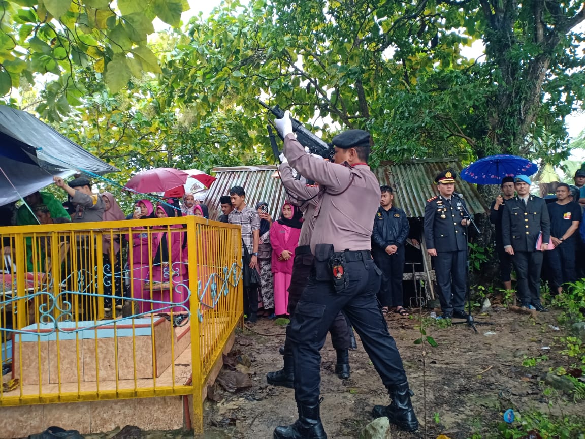 Tembakan salvo dari personil Polres Sinjai sebagai penghormatan terakhir mengiringi prosesi pemakaman.