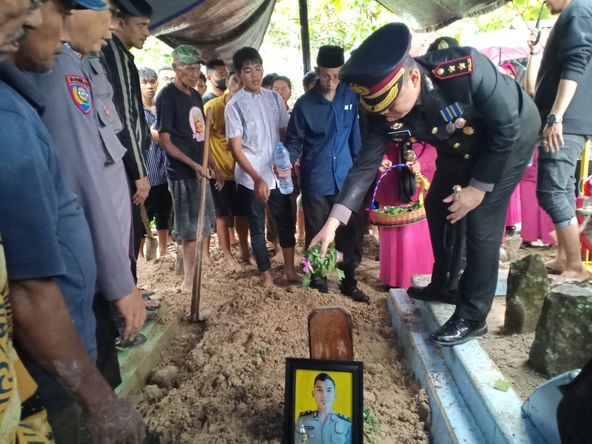 SINJAI, Sul-Sel. Karebanasulsel.id- Hujan Deras mengguyur saat Kapolres Sinjai Akbp Fery Nur Abdulah, S.Ik memimpin upacara pemakaman anggotanya Almarhum Brigpol Sidi M. Janati Personil Bag SDM Polres Sinjai yang meninggal dunia karena sakit.
