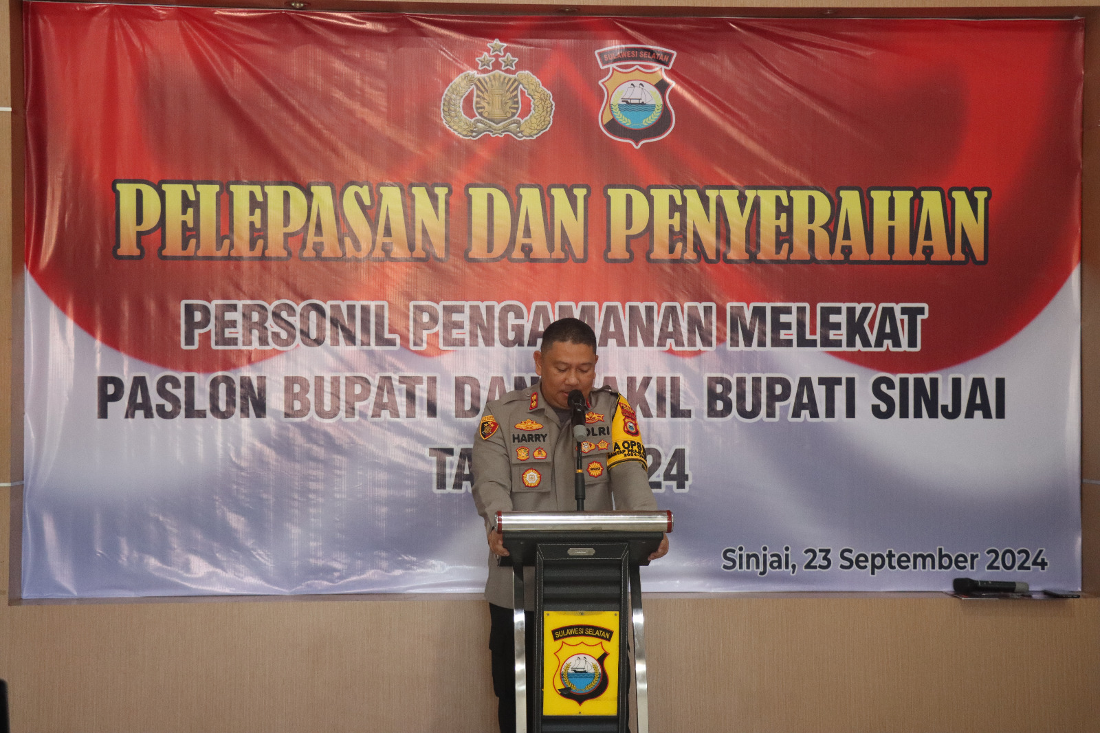 SINJAI, Sul-Sel. Karebanasulsel.id- Kapolres Sinjai AKBP Harry Azhar, SH., S.Ik., MH, secara resmi melepas dan menyerahkan pengamanan melekat kepada pasangan calon Bupati dan Wakil Bupati Sinjai. Senin (23/9/2924).