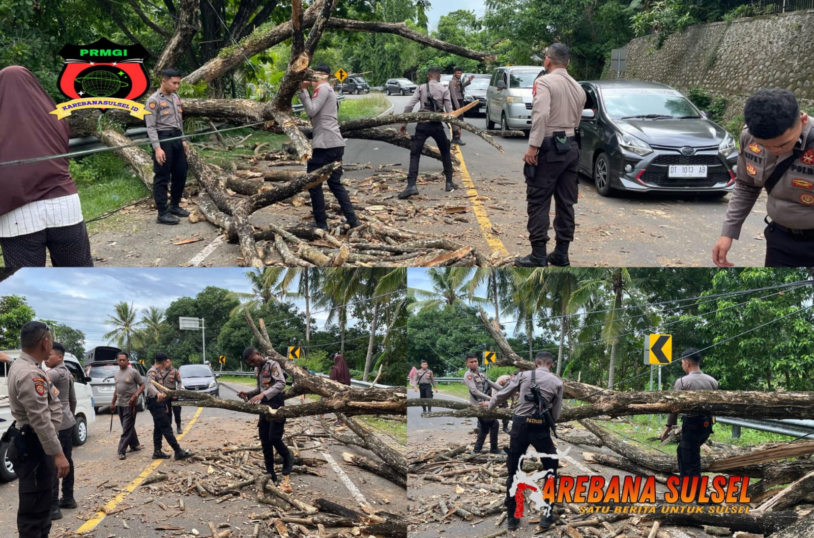 SINJAI, Karebanasulsel.id- Personel Satuan Samapta Polres Sinjai bersama warga bahu-membahu membersihkan pohon tumbang yang menghalangi jalan Poros Sinjai – Bulukumba. Pohon tersebut tumbang akibat angin kencang. Minggu (23/3/2025).