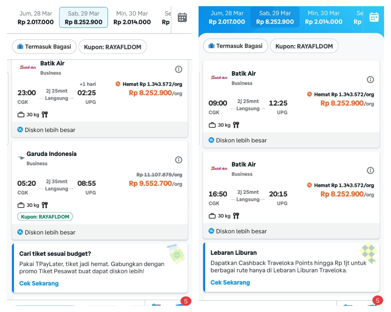 Harga tiket pesawat tujuan jakarta – makassar saat bulan puasa masih pada posisi harga standar dikisaran harga 1,5 jutaan sampai harga 1,7 jutaan akan tetapi saat menjelang H -3 lebaran terjadi kenaikan harga yang sangat besar hingga mencapai 8 jutaan hingga 9 jutaan. Dan itu hasil dari Traveloka.