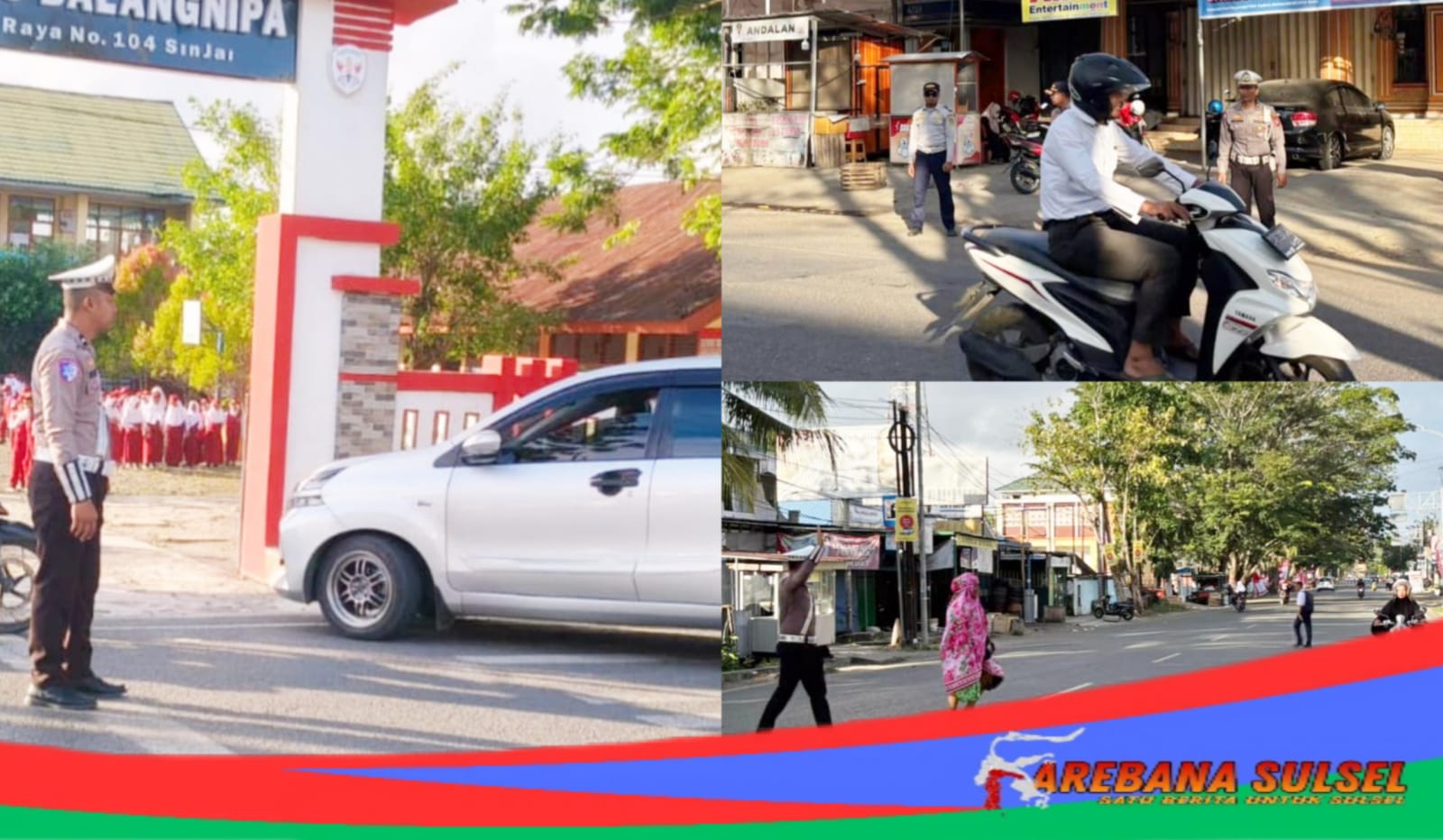 Tidak hanya mengatur kendaraan, personel Satlantas juga aktif membantu menyeberangkan pelajar dan pejalan kaki, serta mengingatkan pengendara untuk menggunakan helm dan mematuhi rambu lalu lintas.