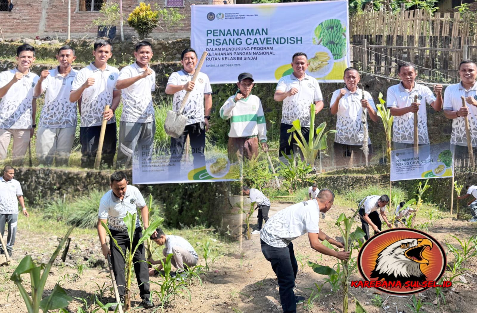 SINJAI, Karebanasulsel.id- Rumah Tahanan Negara (Rutan) Kelas IIB Sinjai terus menunjukkan komitmen nyata dalam mendukung program ketahanan pangan nasional. Hal itu diwujudkan melalui kegiatan penanaman pohon pisang Cavendish dan monitoring persiapan panen jagung yang dilaksanakan di lahan produktif milik Rutan Sinjai, Sabtu (18/10/2025).