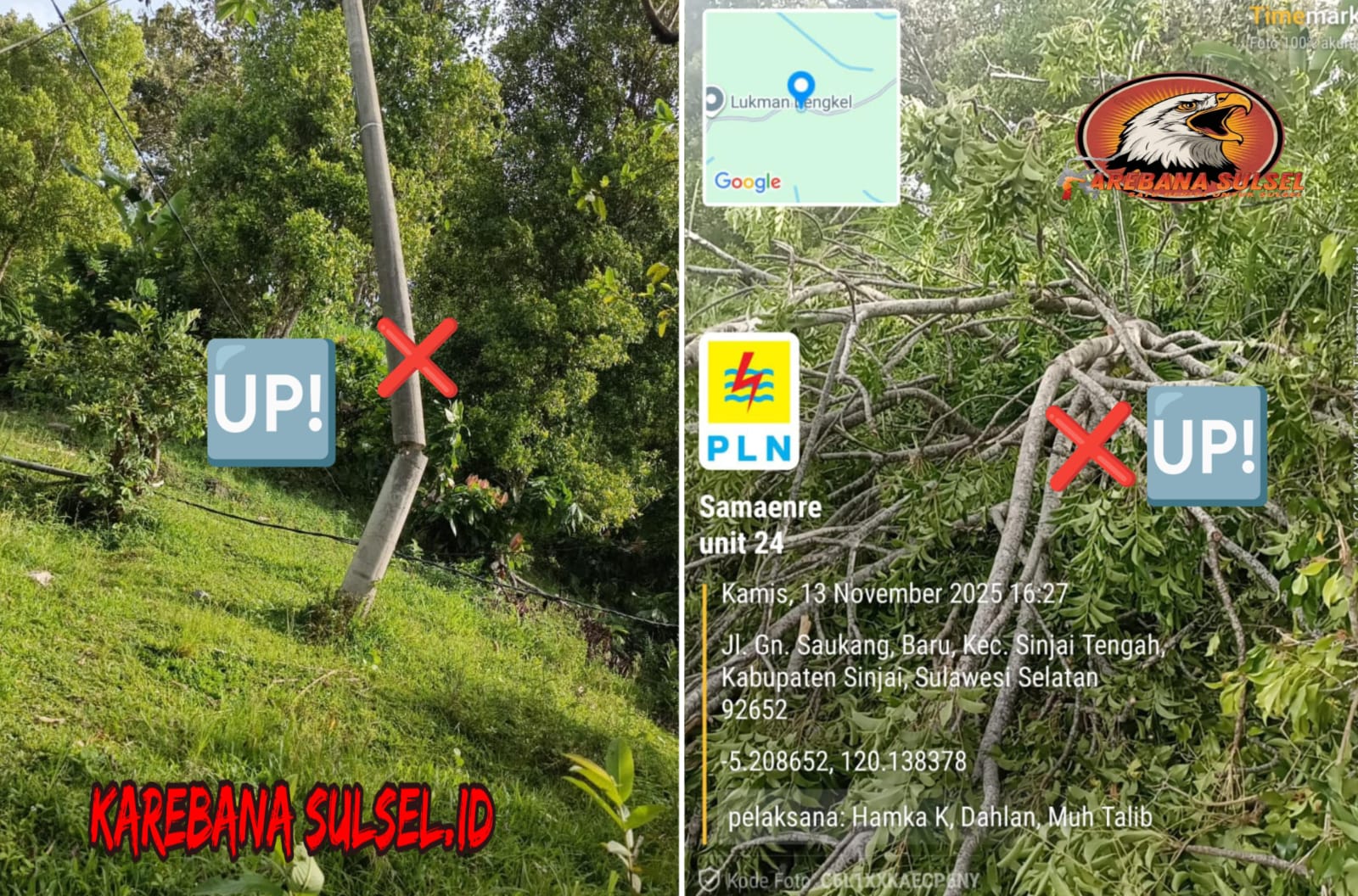 Pelaksana lapangan dari unit Samaenre PLN Sinjai, yang dikoordinir oleh Hamka K. Dahlan dan Muh. Talib, terus berupaya mempercepat proses penggantian tiang dan penormalan jaringan agar listrik dapat segera kembali menyala.