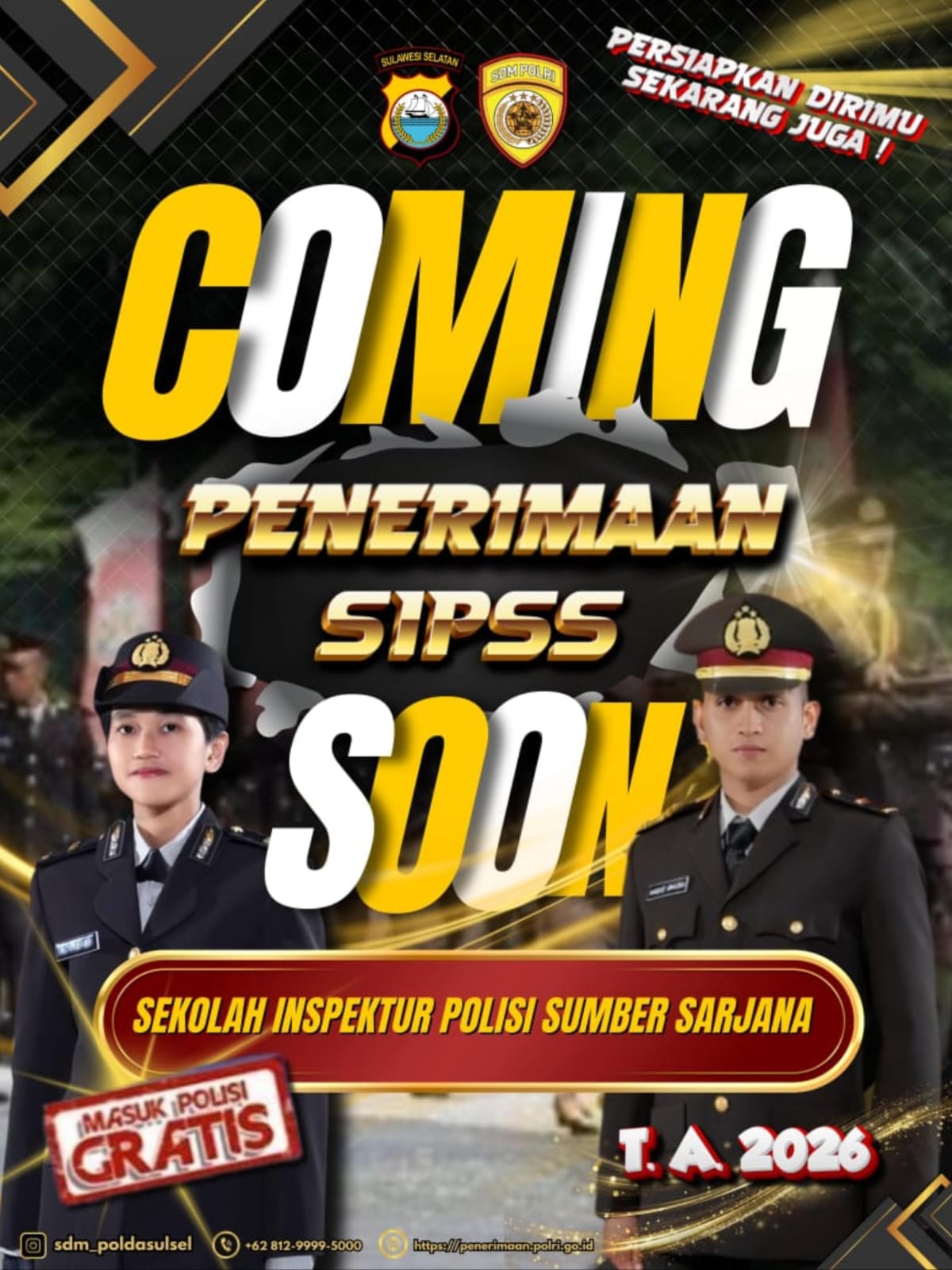Pendaftaran Anggota Polri sumber Sarjana atau SIPSS di buka mulai tanggal 15 Januari sampai dengan 22 Januari 2026. Info lengkap melalui website resmi www.penerimaan.polri.go.id
