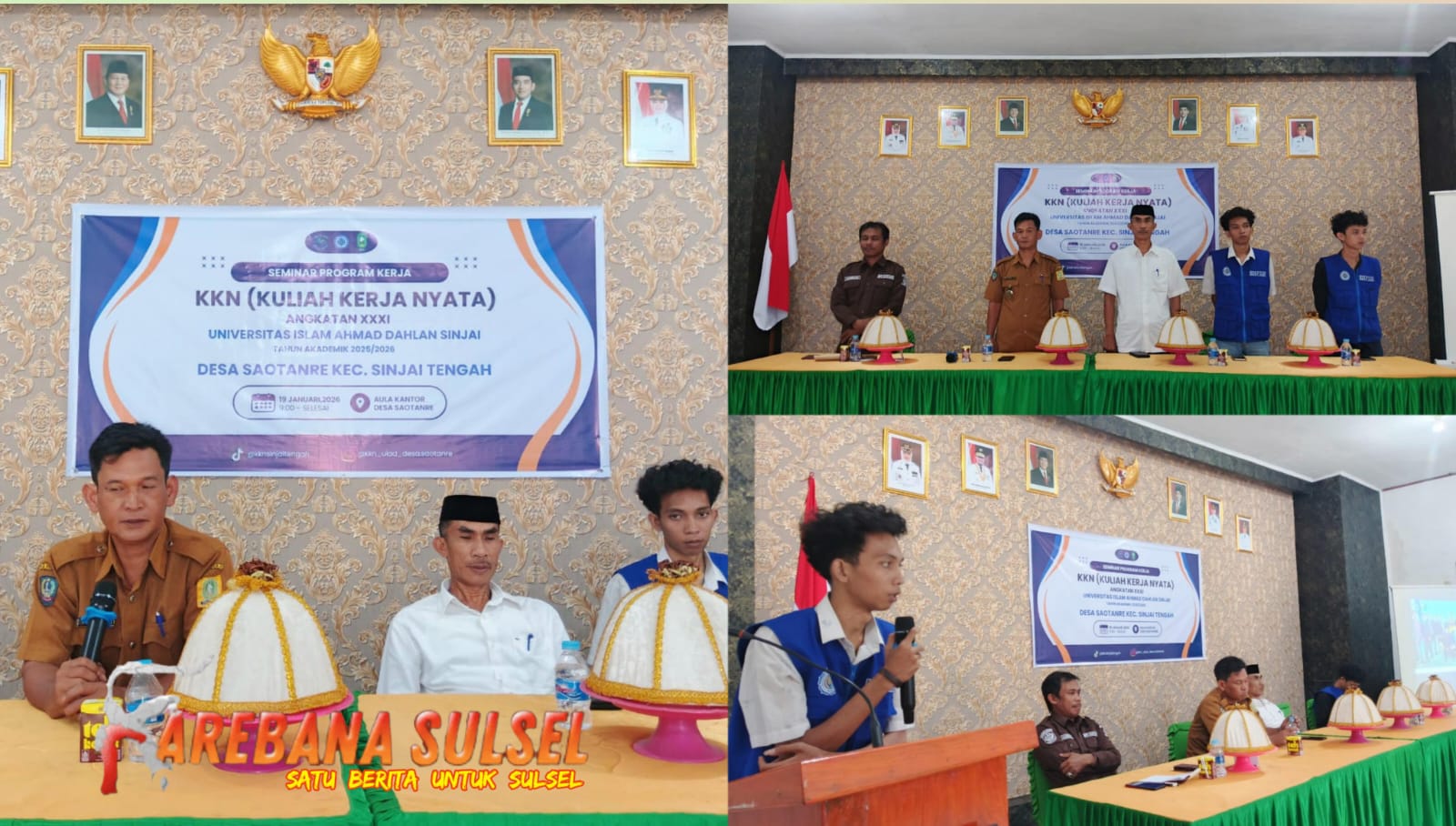 SINJAI TENGAH, Karebanasulsel.id- Mahasiswa Kuliah Kerja Nyata (KKN) Angkatan XXXI Universitas Islam Ahmad Dahlan (UIAD) Sinjai menggelar Seminar Program Kerja di Aula Kantor Desa Saotanre, Kecamatan Sinjai Tengah, Kabupaten Sinjai, Senin (19/1/2026). Seminar ini menjadi tolak ukur awal keseriusan mahasiswa dalam menjawab kebutuhan riil masyarakat desa.